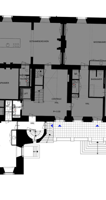De toegang tot het appartement loopt via de gelijkvloerse centrale hal of het souterrain. De bel-etage, met een plafondhoogte van vier meter, biedt een indrukwekkende woonkeuken. Hoge vensters aan drie zijden zorgen voor licht en een prachtig zicht. De brede zwartmarmeren schouw, met aansluiting voor een royale gashaard, vormt het hart van de ruimte. De vloer, voorbereid met een egale epoxylaag, kan naar wens worden afgewerkt met strak parket. Vloerverwarming biedt comfort, zowel in de hal als in de keuken.